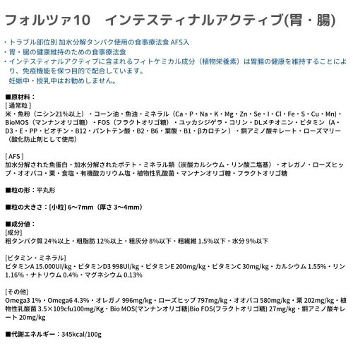 商品名フォルツァ10 インテスティナルアクティブ(胃・腸) 賞味期限別途パッケージ記載 原材料【通常粒】 米・魚粉(ニシン21%以上)・コーン油・魚油・ミネラル(Ca・P・Na・K・Mg・Zn・Se・I・Cl・Fe・S・Cu・Mn)・BioMOS(マンナンオリゴ糖)・FOS(フラクトオリゴ糖)・ユッカシジゲラ・コリン・DLメチオニン・ビタミン(A・D3・E・PP・ビオチン・B12・パントテン酸・B2・B6・葉酸・B1・βカロチン )・銅アミノ酸キレート・ローズマリー(酸化防止剤として使用) 【AFS】 加水分解された魚蛋白・加水分解されたポテト・ミネラル類(炭酸カルシウム・リン酸二塩基)・オレガノ・ローズヒップ・オオバコ・栗・食塩・有機酸カリウム塩・植物性乳酸菌・マンナンオリゴ糖・フラクトオリゴ糖 内容量100g 広告文責FELLOW SHIP株式会社/092-985-8007 輸入者・メーカー名株式会社トリッコインターナショナル 商品区分ペットフード 製造国イタリアイタリア獣医師チームの研究開発よるナチュラル食事療法食 一般的に犬猫のフードは、「肉が多い」「生肉」「消化に良い原料」や「人間が食べるレベルの原料」等の使用が安全で高品質といわれていました。