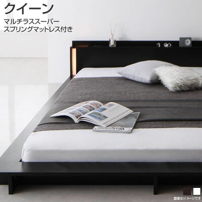 送料無料 ベッド クイーンベッド マルチラススーパースプリングマットレス付き 木製 幅186 ローベッド 照明付き コンセント付き 棚付き 幅木よけ 床板仕様 簡単組み立て SPERANZA スペランツァ ブラック/ホワイト