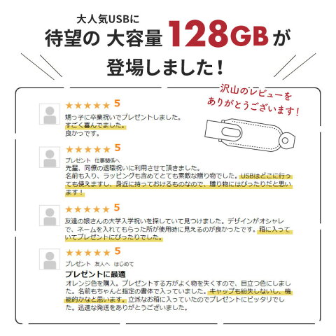▼お問い合わせ前にご確認ください▼ Powered by EC-UPさまざまなギフトや記念品をご用意しております ■お祝いのお品として 内祝 内祝い お祝い返し ウェディングギフト ブライダルギフト 引き出物 引出物 結婚引き出物 結婚引出物 結婚内祝い 出産内祝い 命名内祝い 入園内祝い 入学内祝い 卒園内祝い 卒業内祝い 就職内祝い 新築内祝い 引越し内祝い 快気内祝い 開店内祝い 二次会 披露宴 お祝い 御祝 結婚式 結婚祝い 出産祝い 初節句 七五三 入園祝い 入学祝い 卒園祝い 卒業祝い 入社祝い 入社式 昇進祝い 昇給祝い 成人式 就職祝い 昇進祝い 新築祝い 上棟祝い 引っ越し祝い 引越し祝い 開店祝い 退職祝い 快気祝い 全快祝い 初老祝い 還暦祝い 古希祝い 古稀祝い 喜寿祝い 傘寿祝い 米寿祝い 卒寿祝い 白寿祝い 還暦 古稀 古希 喜寿 傘寿 米寿 卒寿 白寿 長寿祝い 金婚式 銀婚式 ダイヤモンド婚式 結婚記念日 ギフト ギフトセット セット 詰め合わせ 贈答品 お返し お礼 御礼 ごあいさつ ご挨拶 御挨拶 プレゼント お餞別 引越し 引越しご挨拶 記念日 誕生日 父の日 母の日 敬老の日 記念品 卒業記念品 定年退職記念品 ゴルフコンペ コンペ景品 景品 賞品 お中元 御中元 お歳暮 御歳暮 お年賀 御年賀 残暑見舞い 年始挨拶 話題 のし無料 メッセージカード無料 ラッピング無料 手提げ袋 大量注文 大口注文 ■このような方への贈り物として 父 母 父親 母親 ちち はは お父さん お母さん 両親 親戚 家族 兄弟 姉妹 兄 弟 姉 妹 義父 義母 祖父 祖母 曽祖父 曾祖母 叔父 叔母 おじいちゃん おばあちゃん 友人 友達 友だち 男友だち 女友だち 男友達 女友達 男子 女子 親友 同級生 旦那さん 奥さん 夫 妻 彼氏 彼女 先生 生徒 同僚 上司 取引先 部下 先輩 後輩 20代 30代 40代 50代 60代 70代 80代 ■このようなシーンの記念品として 保育園 幼稚園 学校 小学校 中学校 高校 高等学校 専門学校 専門 大学 大学院 研究室 部活 クラブ クラブチーム サークル 野球 サッカー バスケットボール バスケ バレーボール バレー テニス バドミントン バド 卓球 剣道 柔道 陸上 吹奏楽 オーケストラ 演劇 書道 美術 クラス クラスメート クラスメイト商品名 名入れ USBメモリ 128GB オーバリットcover 規格 USB3.1 Gen1 サイズ 91.6mm×28.5mm 厚み 10mm 重さ 14g 素材 PUレザー カラー ブラウン 商品説明 社会人でも学生でもしっかり使える128GBのUSBメモリ。