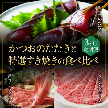 【ふるさと納税】 《3か月定期便》かつおのたたきと特選すき焼きの食べ比べ定期便/1回目:訳ありカツオたたき1.5kg、2回目:土佐和牛霜降りスライス(うで)500g、3回目:土佐和牛 A5 特選クラシタローススライス500g 故郷納税