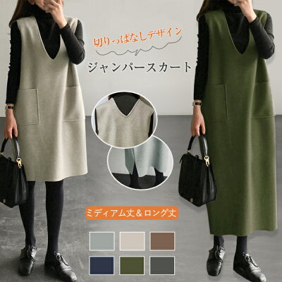 2022AW新作 ジャンパースカート ロングワンピース 深めvネック ワンピース 膝丈 秋 冬 無地 シンプル ゆったり カジュアル フォーマル マタニティ 通学 通勤 重ね着 レイヤード 着やせ 上品 ワンピスター 2022AW在庫限定