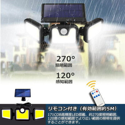 ソーラーライト 2台セット 171COB 3灯式 リモコン付き 5mコード付き センサーライト 防犯ライト ガーデンライト アウトドア ソーラーフラッドライト キュリティライト 照明 IP65防水 防犯 人感 防水 屋外照明 太陽光発電 アウトドア 庭 玄関 駐車場 通路 送料無料